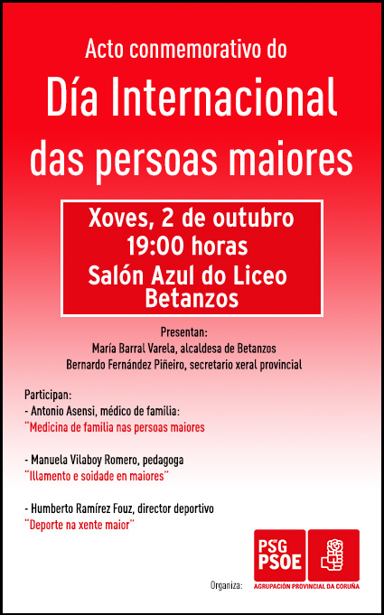 Presentarán o acto María Barral Varela, alcaldesa de Betanzos, e o noso secretario xeral provincial, Bernardo Fernández Piñeiro.
