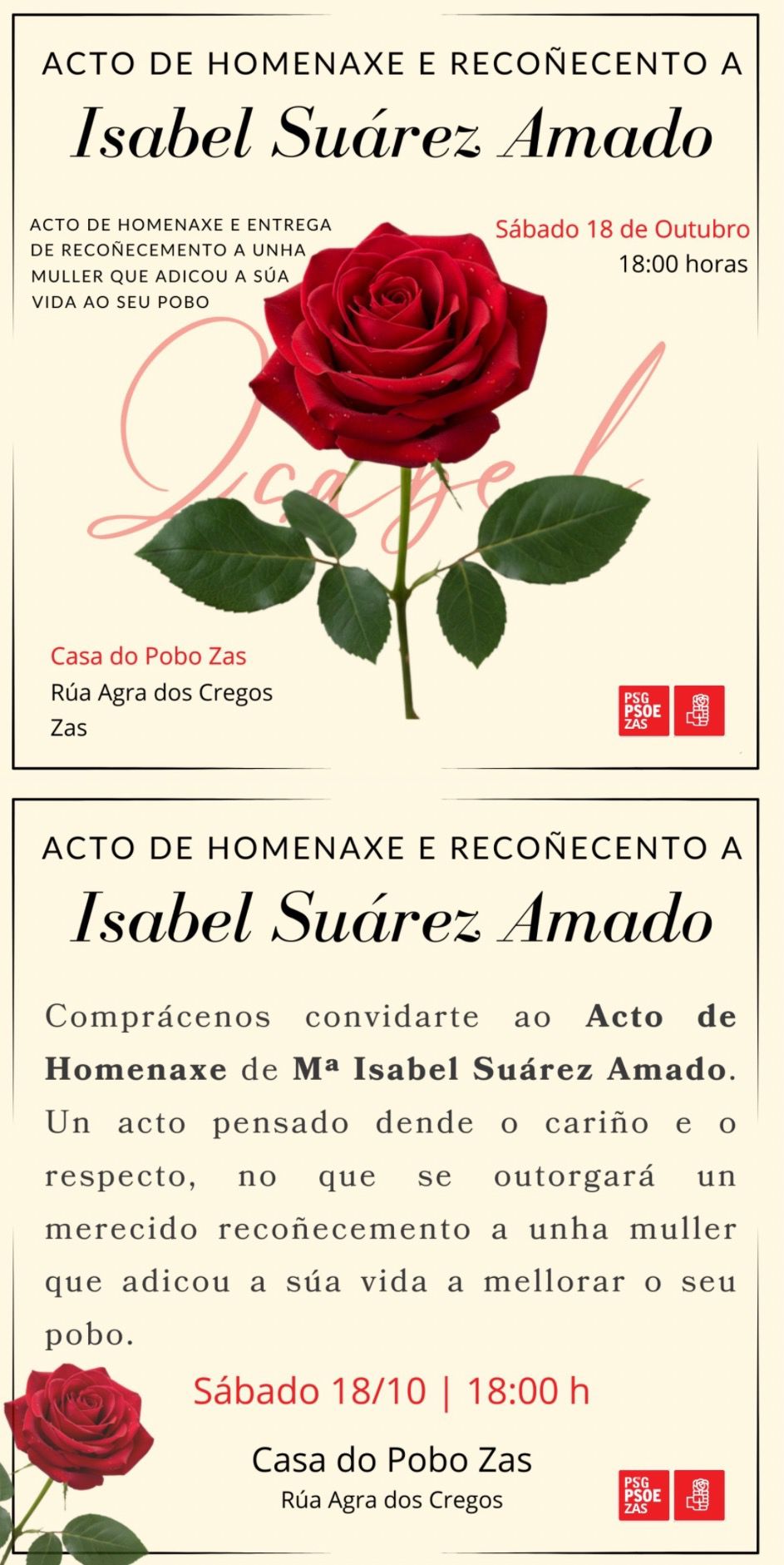 O vindeiro día 18 de outubro ás 18:00, o PSdeG de Zas fará un acto de homenaxe e recoñecemento a Isabel Suárez Amado, figura clave do tecido asociativo da vila, falecida no ano 2018.
