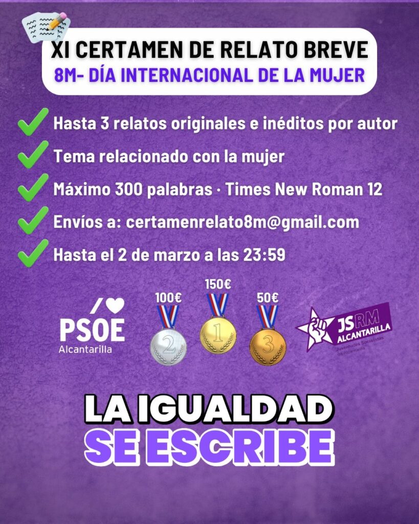 Puedes consultar las bases en el siguiente enlace: https://agrupacionespsoe.es/alcantarilla/bases-xi-certamen-relato-corto-8m-dia-internacional-de-la-mujer/