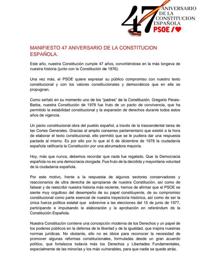 Un año más, desde el PSOE queremos reafirmar nuestro compromiso con el texto constitucional y con los valores democráticos que en él se propugnan.