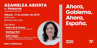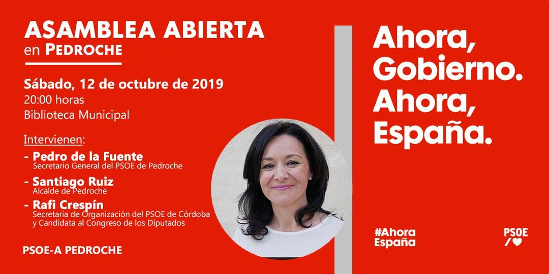 PSOE PEDROCHE Asamblea Abierta con la participación de Rafi Crespín 12 / 10 / 2019 Hemos tenido una ASAMBLEA ABIERTA en Pedroche, con la intervención de RAFI CRESPÍN, candidata del PSOE al Congreso de los Diputados y Secretaria de Organización del PSOE de Córdoba. Comparte esta noticia Palabra clave También te puede interesar... 07 / 06 / 2023 Pedro de la Fuente en la candidatura socialista al Congreso La secretaria general del PSOE en Córdoba, Rafi Crespín, ha dado cuenta este miércoles a la ejecutiva provincial de su partido de la propuesta de listas electorales para las Cortes, de cara al 23J, que presentará este mismo día al Comité Provincial del partido, para su aprobación. Según ha informado el PSOE cordobés, una vez ... Afíliate RRSS Visítanos en nuestras redes Tweets de PSOEPedroche Síguenos en Twitter Síguenos en Facebook