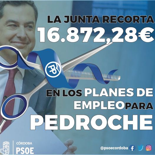 La Junta de PP y Ciudadanos destina en 2020 a Pedroche la cantidad de 55.531,81 euros para la creación de empleo frente a 72.404,09 euros que llegó en 2018 procedente de un Gobierno socialista.