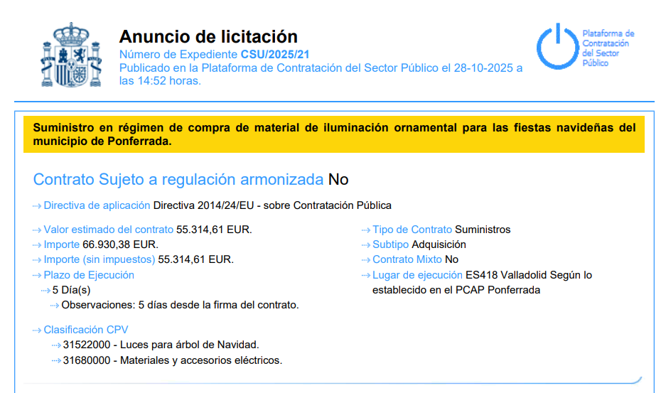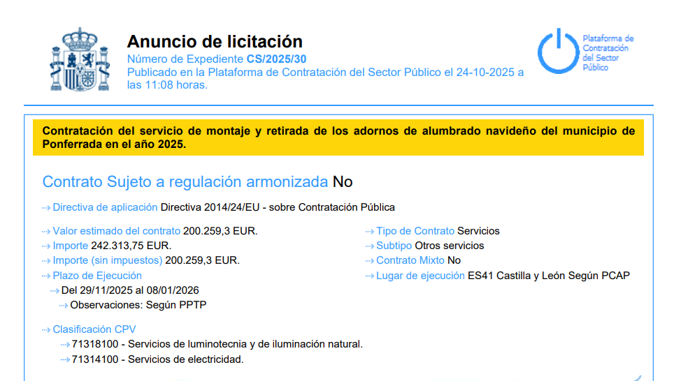 El SOMACYL está licitando la iluminación de navidad de Ponferrada en dos contratos que suman más de 255.000 euros entre ambos más el IVA, lo que supone más de 300.000 euros que tienen previsto gastarse de los 400.000 euros de inversión que le corresponde anualmente a todo el municipio.